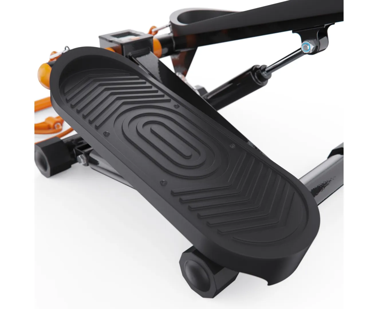 Гидравлическая система с механической регулировкой позволяет плавно и тихо менять интенсивность шага. Широкие педали 30 х 10,5 см с рельефным покрытием безопасны и удобны. Компенсаторы неровностей пола обеспечивают устойчивость. Максимальный вес пользователя — 110 кг.